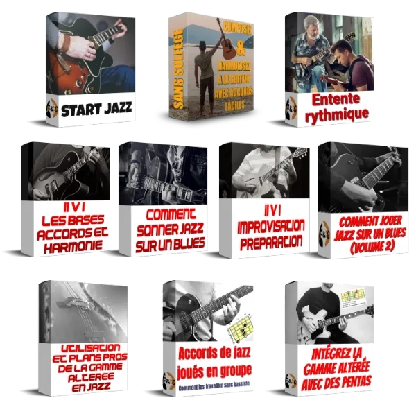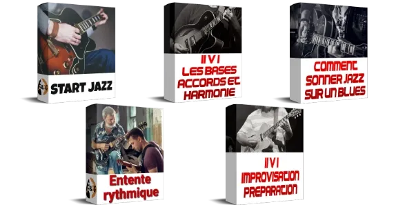 5 formations : Start Jazz, Entente Rythmique, Comment sonner Jazz sur un Blues, II V I Bases Accords et Harmonie, II V I Préparation à l'improvisation